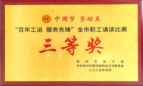 为深入学习贯彻党的二十届三中全会精神,庆祝中华全国总工会成立100周年,公司刘露、王敏两位同志代表云龙区总工会参加徐州市总工会、中共徐州市委市级机关工作委员会联合举办的“中国梦·劳动美--百年工运 服务先锋”全市职工诵读比赛,并斩获三等奖。他们用声音传递了平凡岗位上的不凡坚守,展现了公司“服务为荣”的企业精神与劳模工匠的熠熠风采。